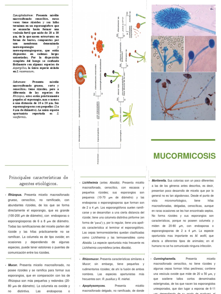 Generalmente, las especies de los géneros mucor , rhizopus , absidia y cunninghamella están implicadas con mayor frecuencia. Identificación molecular (secuenciación) presentan hifas sin septos (no septadas o cenocÃticas) y se reproducen mediante endosporas asexuales (esporangiosporas) o mediante. SÃndrome clÃnico grave frecuente en pacientes con acidosis y diabetes mellitus. Tiles para mucormicosis pulmonar, abscesos rinocerebrales. La mucormicosis (anteriormente conocida como cigomicosis) es una enfermedad rara, no se trata de una enfermedad contagiosa, los mucorales se encuentran en el ambiente y pueden entrar por vÃas respiratorias (también digestiva o a través de heridas en la piel).